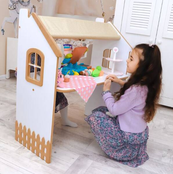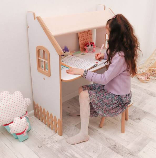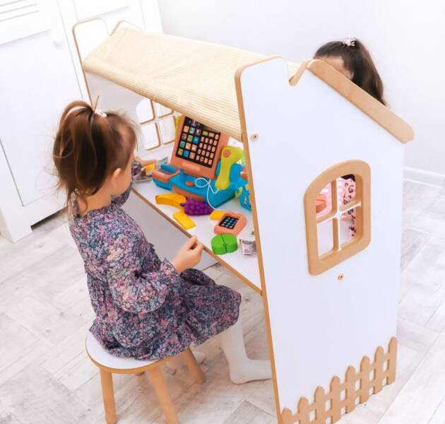 Et børnebord er et møbel, der kombinerer to funktioner: det fungerer som et studiebord og kan fungere som en legebutik/basar i træ.